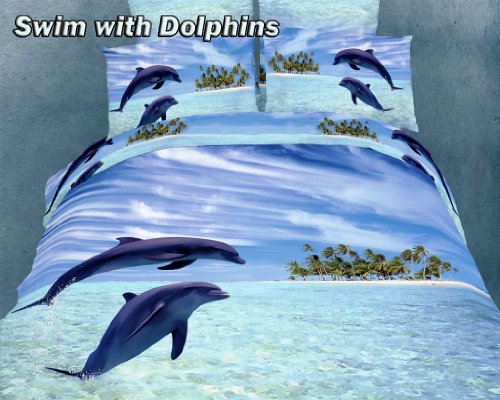 Transform your bedrooms energy with this spectacular animal themed bedding of adorable dolphins dancing on the crystal blue ocean and set the perfect mood for your boys or girls bedding decor. These superb Dolce Mela Duvet Cover Sets are crafted with State of the Art reactive printing panels and natural plant dyes on 100% Egyptian cotton. They feature exclusive centered Hi-RES designs that retain the vibrant colors for many years of proper washing. Decorate with style or treat a friend to a housewarming gift or a bridal shower. 6 Pieces Luxury Duvet Cover Set Bed in a Box with Reversible Design. Fits Full or Queen Size mattress up to 16 inches tall. Designed for exceptional softness and comfort with 100% Soft Cotton at 305 TC. Set includes: 1 Fitted bed sheet, 1 Duvet Cover, 2 Pillow cases and 2 Pillow Shams. Snaps at the foot of the duvet cover make it easy to insert a comforter, quilt or blanket. Superior workmanship of combed yarns and sateen weaving produce a soft and lustrous look and eliminate typical wrinkling. Printed with the latest reactive dyeing technology for excellent brightness and long lasting colors. The sheets feel soft and inviting and are guaranteed for many years of reusable life. The complete bedding set comes in an elegant gift box and a Dolce Mela designer gift bag. Machine Washable: Normal w Cool Water - NO BLEACHING AGENTS - Tumble Dry.