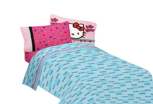 Your daughter will love the newest collection of Hello Kitty bedding. This full sheet set has a pink fitted sheet with all over hearts, the flat sheet is light blue with blue clouds and 2 pillowcases that reverse for two different looks. Made of 100-percent polyester microfiber. Easy care.