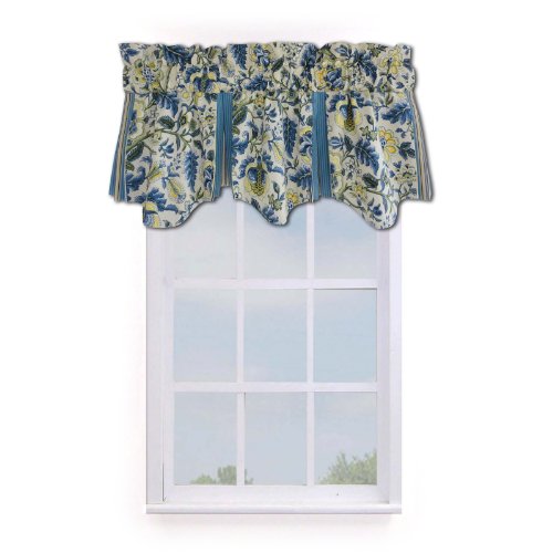 Imperial Dress Porcelain is a classic Waverly pattern true to the brand's timeless tradition. It's inspired by classic Jacobean patterns, yet styled with a modern twist. The Porcelain color story is exemplified here in bright blue and white with soft green and warm yellow accents. Striped valance with pleated insets a 2-inch header and 3-inch rod pockets.