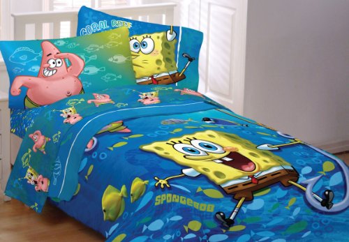 - Spongebob Fish Swirl full-twin comforter, full size flat and fitted sheets, and two pillowcases.