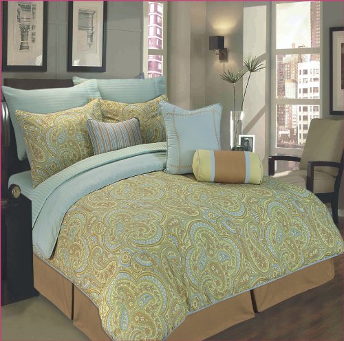 Castle Hill 11-Piece bedding set gives comfort and classic beauty to your bedroom all in one package. The 100-Percent reversible cotton paisley blue and taupe color printed 101"x86" full size comforter is filled with 100-Percent polyester fiber. Reverse the comforter and shams to a solid blue color when you want to change the decor in your room. The set of 2 shams in the same reversible paisley pattern on one side and solid on the other are 21"x26" with 2" flange. Top of bed design is completed with 3 decorator pillows made of 100-Percent cotton and filled with 100-Percent polyester. Two of the pillows are 16"x16"; the third is round 14"x7". A rich solid camel color bed skirt totally compliments the paisley design. For a cozy sleep; a 310TC 100-Percent cotton sateen stripe sheet set with 2 king size 20"x40" pillow cases in light blue color completes the set. Easy care; washable in cold water; tumble dry on low heat.