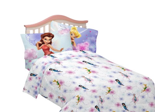 Disney's Fairies Floral Frolic bedding will let your daughter dream about playing with Tinkerbell and her Fairy Friends in Pixie Hollow. This twin sheet set has a blue fitted sheet with flower, a white flat sheet with flowers and Fairies and the standard pillowcase reverses for 2 different looks. Made of 100% polyester microfiber. Easy care.