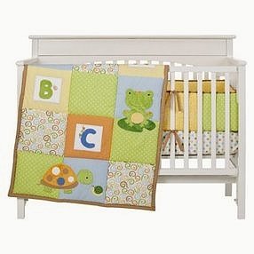 Part of the Pond Friends collection, this crib set features embroidered pond creatures (turtle, frog, bug, etc.) and letters in shades of blue, green, yellow, and orange. It includes a quilt, bumper, and fitted sheet. CRIB SIZE.
